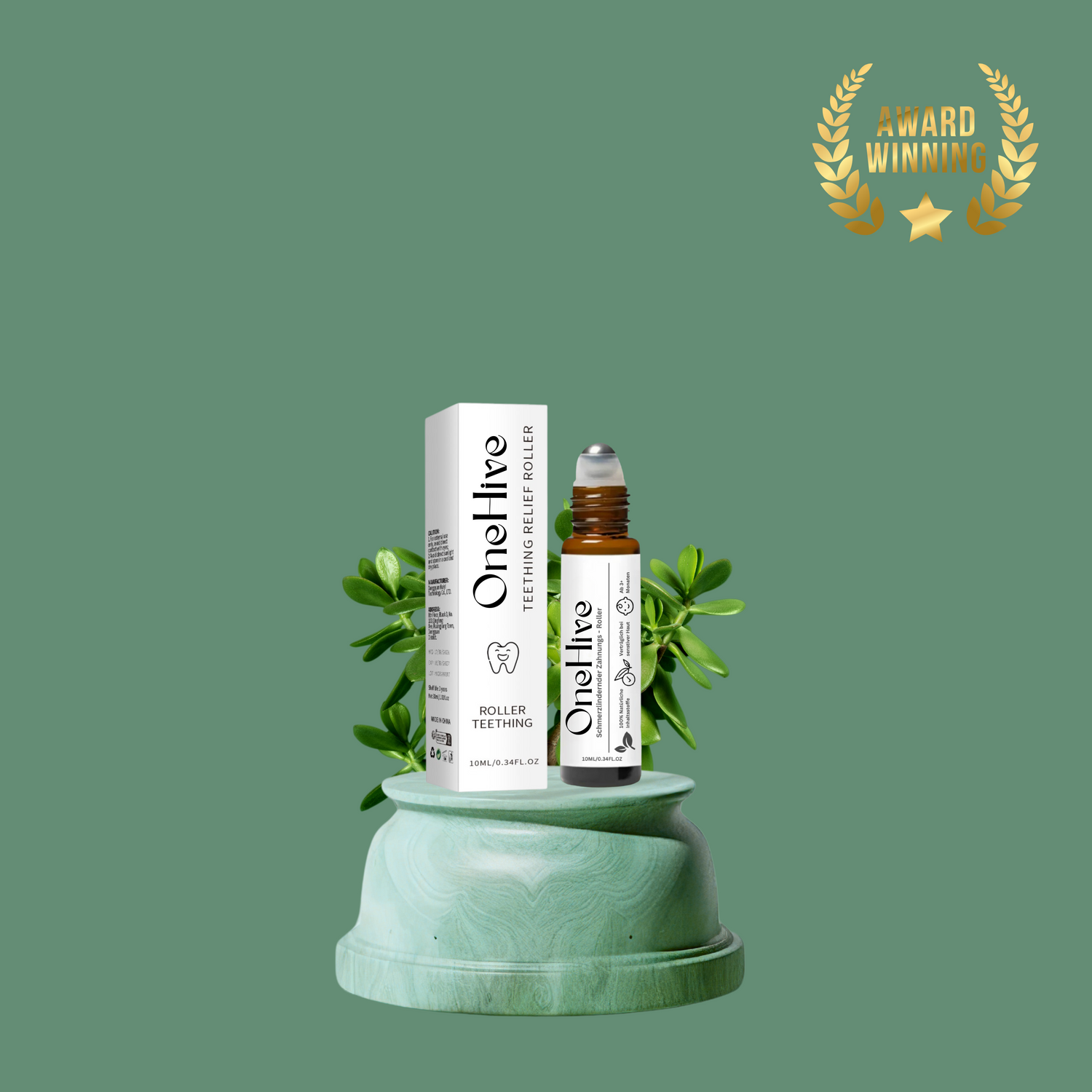 Natürlicher Zahnungshilfe-Roller für Babys – einfach anzuwenden, sanft zur Haut und perfekt für unterwegs.