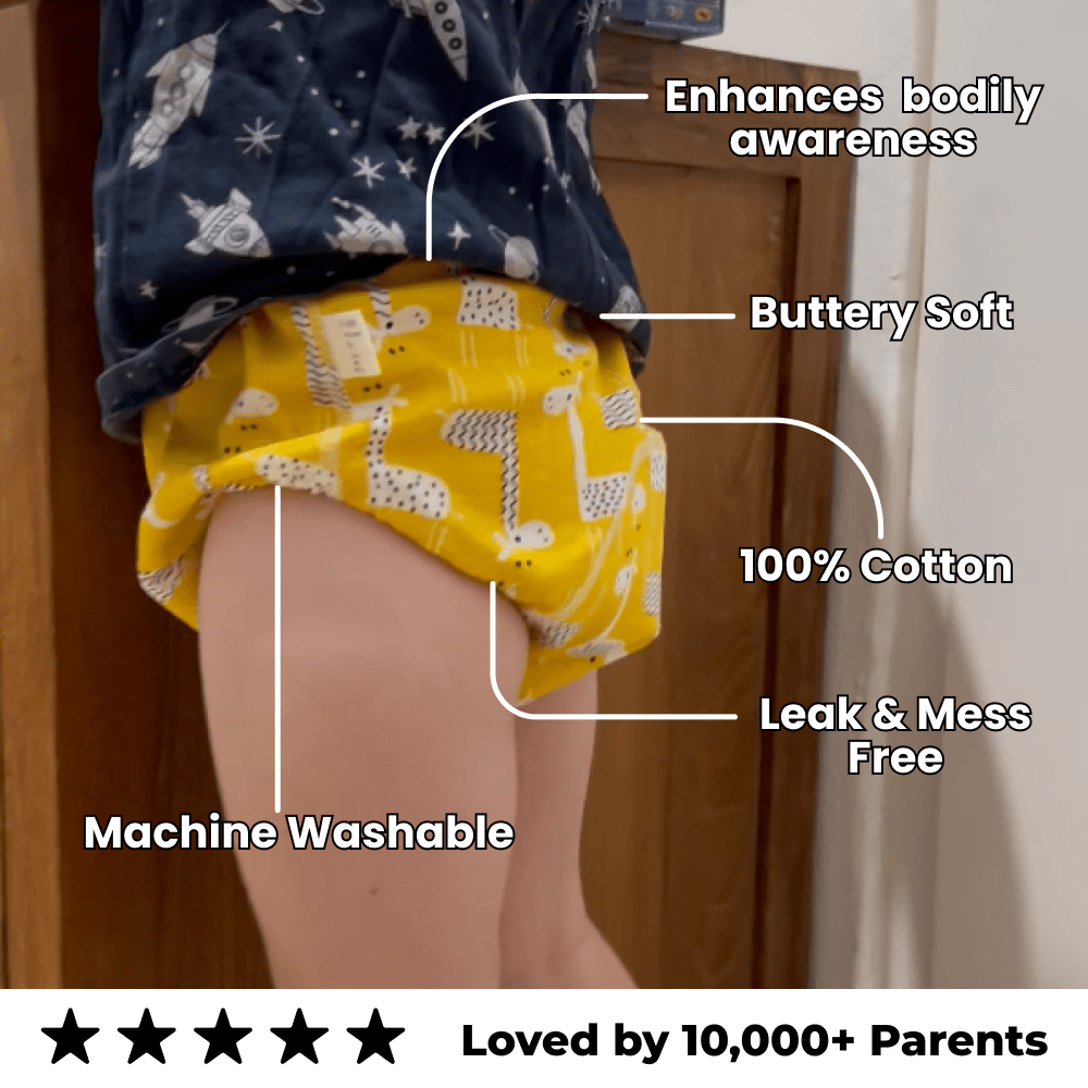 Unsere weichen und auslaufsicheren Trainingsunterhosen aus 100 % Baumwolle helfen deinem Kind, das Körperbewusstsein zu fördern. Waschbar, nachhaltig und geliebt von über 10.000 Eltern!